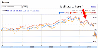 Next time you hear a Democratic talking head spouting the usual blame on Bush regarding the current economic crisis, remember that the stock market crash started once Wall Street realized Obama could actually become President. It’s not about the last 8 years, or the last 4 years. After Clinton “the blameless one” handed off the dot bomb to Bush in 2001, the stock market floundered a bit as it recovered from ridiculous over pricing in tech stocks. The market recovered in late 2002 and began a steady increase over the next 6 years. These images show that crucial spikes and dips are strangely related to points in the election that showed Obama on the rise, and then McCain surging. Once it became clear that Obama would win, the market dropped faster than flight 3407 over Buffalo.